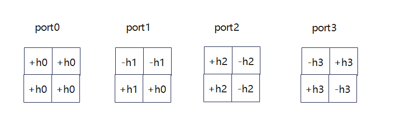 H0=h0+h1+h2+h3H1=h0−h1+h2−h3H2=h0+h1−h2−h3H3=h0−h1−h2+h3⇓h0=H0+H1+H2+H34h1=H0−H1+H2−H34h2=H0+H1−H2−H34h3=H0−H1−H2+H34 H_0=h_0+h_1+h_2+h_3\\ H_1=h_0-h_1+h_2-h_3\\ H_2=h_0+h_1-h_2-h_3\\ H_3=h_0-h_1-h_2+h3\\ \Downarrow\\ h_0=\frac{H_0+H_1+H_2+H_3}{4}\\ h_1=\frac{H_0-H_1+H2-H_3}{4}\\ h_2=\frac{H_0+H_1-H_2-H_3}{4}\\ h_3=\frac{H_0-H_1-H_2+H_3}{4} H0=h0+h1+h2+h3H1=h0−h1+h2−h3H2=h0+h1−h2−h3H3=h0−h1−h2+h3⇓h0=4H0+H1+H2+H3h1=4H0−H1+H2−H3h2=4H0+H1−H2−H3h3=4H0−H1−H2+H3