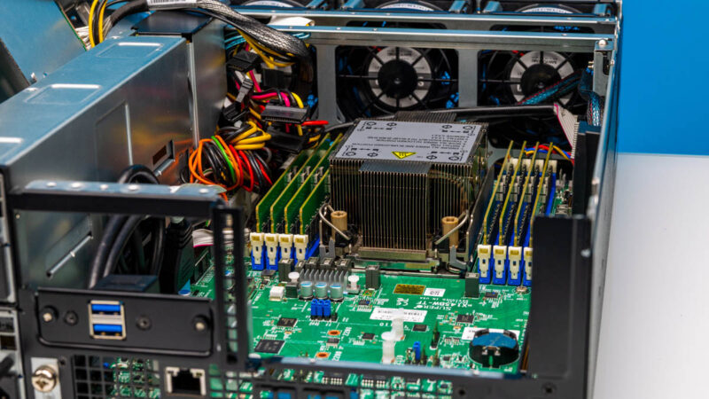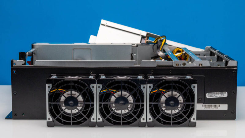 打开顶盖后,可以直观感受到这台服务器在空间利用上的高度集成。机箱内的散热风扇为热插拔设计,方便在不影响系统运行的情况下进行维护。