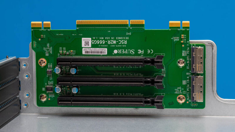 在机箱边缘与 PCIe 转接区域,可以看到一个用于固定和释放转接板的小型卡扣结构。该转接板上承载着三条 PCIe 5.0 x16 插槽。为了为这些插槽提供足够的带宽,主板通过两个 MCIO x8 接口连接转接卡,实现 PCIe 通道扩展。