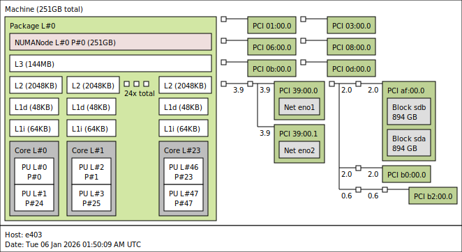 从系统拓扑结构可以看到一个值得注意的设计细节:处理器插槽位于整机底部。这种布局在常规服务器中并不常见,但在 E403 系列中已经形成了一定的设计延续。