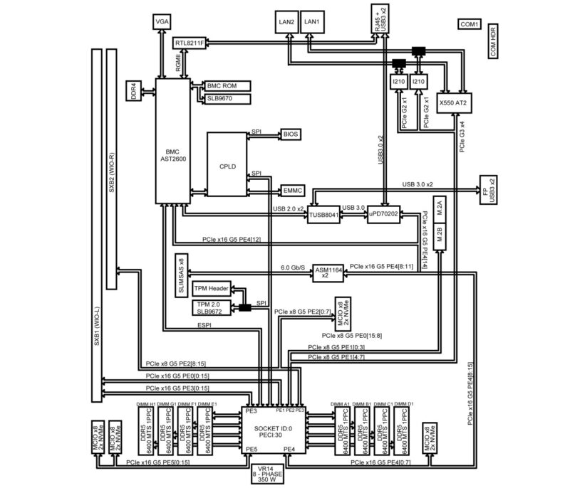 此外,主板还集成了两个 PCIe 5.0 x2 规格的 M.2 插槽,以及多个 MCIO 接口,用于支持 NVMe 与 PCIe 扩展通道。板载 ASPEED AST2600 BMC 控制器,满足远程运维与带外管理需求。