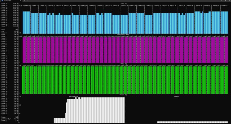 需要说明的是,至强 6521P 的 TDP 为 225W,而 SYS-E403-14B-FRN2T 的散热能力上限为 300W,两者之间留有充足余量。在持续负载条件下,处理器频率与性能输出表现稳定。