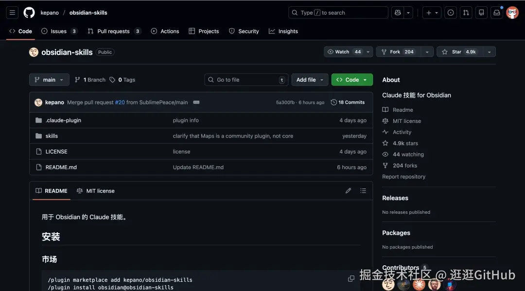 obsidian-skills 是由 Obsidian 的 CEO Steph Ango 亲自开源的项目,专门用于教 Claude Code 如何正确地理解、编写和管理 Obsidian 的笔记文件。
