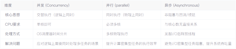 误区澄清: "Asynchronous is not Concurrency."(异步不是并发)。这是一个极其重要的区分。异步是一种允许代码以非线性(多任务角度)顺序正确执行的属性,它能够用来实现并发,但其本身并非并发。异步可以在单线程上实现(一个线程发起请求后去做别的事),而并行则必须是多个线程在多个CPU核心上同时执行。