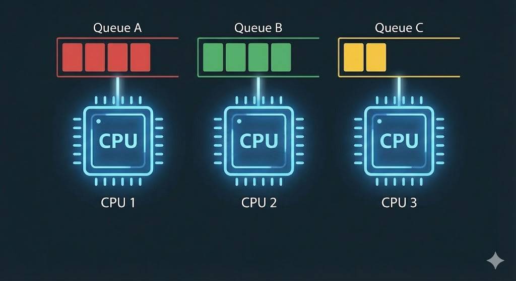 前提: 并行必须依赖于多核CPU。在多核处理器上,每个核心可以在完全相同的时刻独立地执行一个不同的任务指令,实现物理意义上的"同时"。