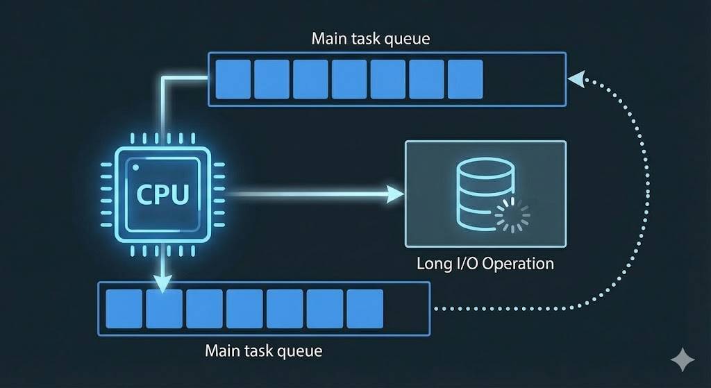 机制: 当一个线程发起一个异步I/O操作时(例如,在.NET中调用 await client.GetStringAsync(...)),它并不会原地阻塞等待。实际发生的过程是: