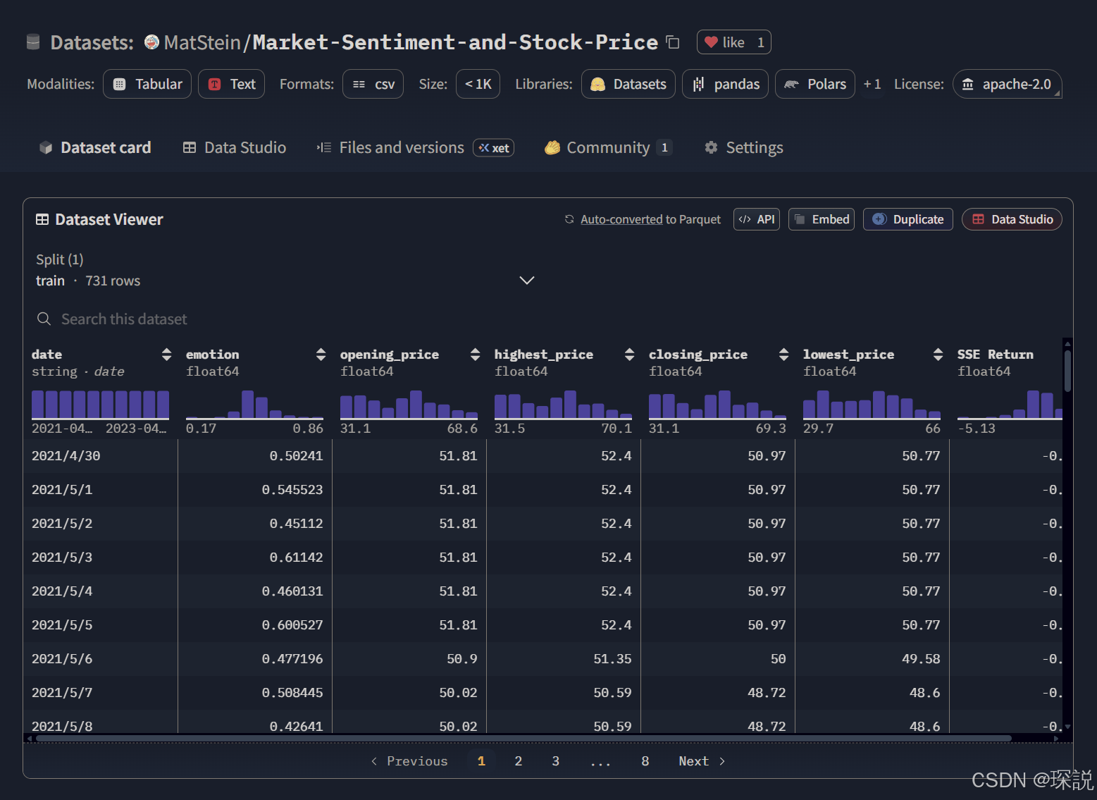在 Huggingface 上找到了一份针对单支股票的小型股票数据集(MSSP),目前在中文社区中没有见到有人推荐它的,本文应该是中文社区中第一个介绍它的。