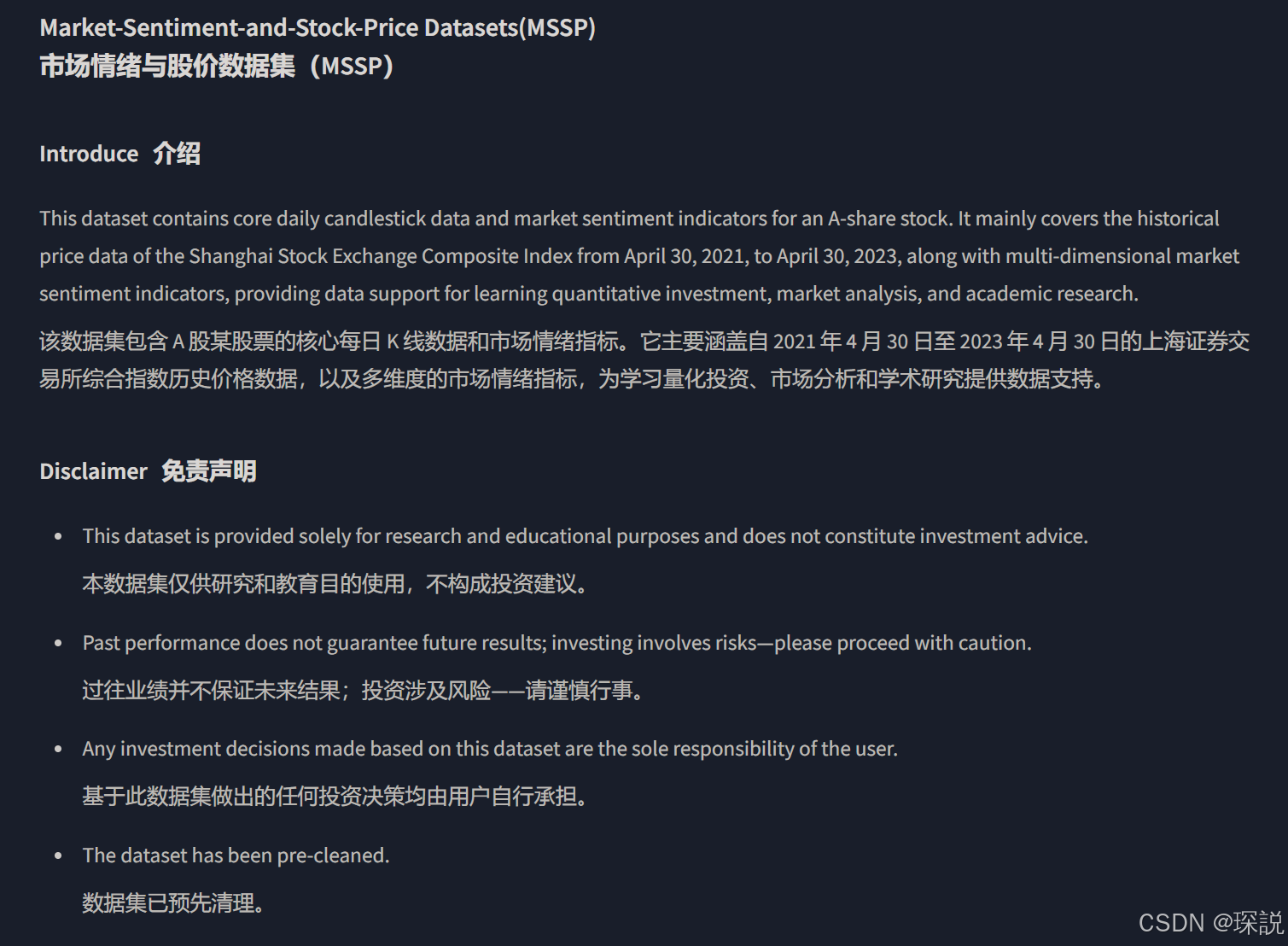 MSSP数据集包含 A 股某股票的核心每日 K 线数据和市场情绪指标。主要涵盖自 2021 年 4 月 30 日至 2023 年 4 月 30 日的上海证券交易所综合指数历史价格数据,以及多维度的市场情绪指标,为学习量化投资、市场分析和学术研究提供数据支持。数据集很小,一共才七百多个样本,但质量很高,非常适合用来跑分验证时间序列模型。