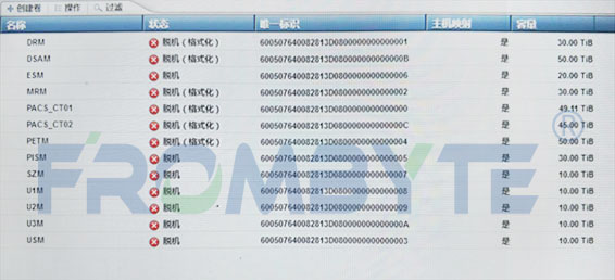 某品牌服务器存储+多台存储阵列柜,总计近100块硬盘,划分了20组lun。