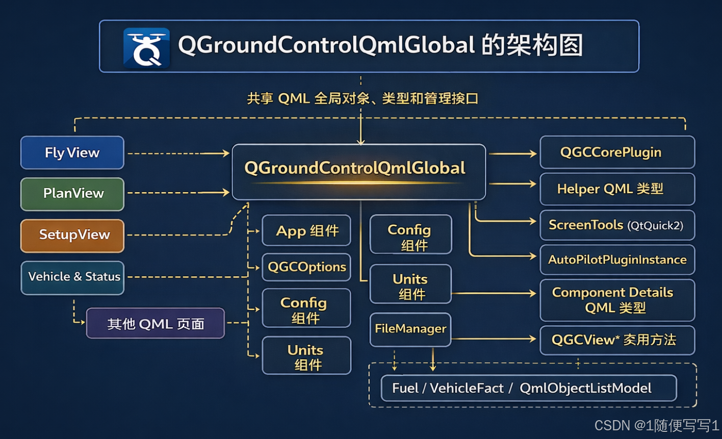 熟悉的朋友应该都知道,QGroundControl还有另外一块,就是它是用qml生成的界面,来看下,QGroundControlQmlGlobal的架构图