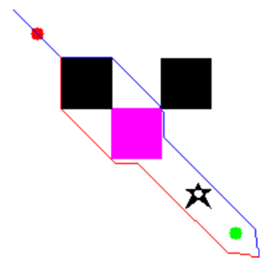 - 编程绘制两幅图片:my_map.png 和 my_map_newobs.png,其中绘制的图片my_map.png包含了起点和终点,并且周围有多个不规则形状的黑色障碍物,空白区域表示可以走的路线。在绘制的图片my_map_newobs.png 中包含了黑色矩形障碍物。