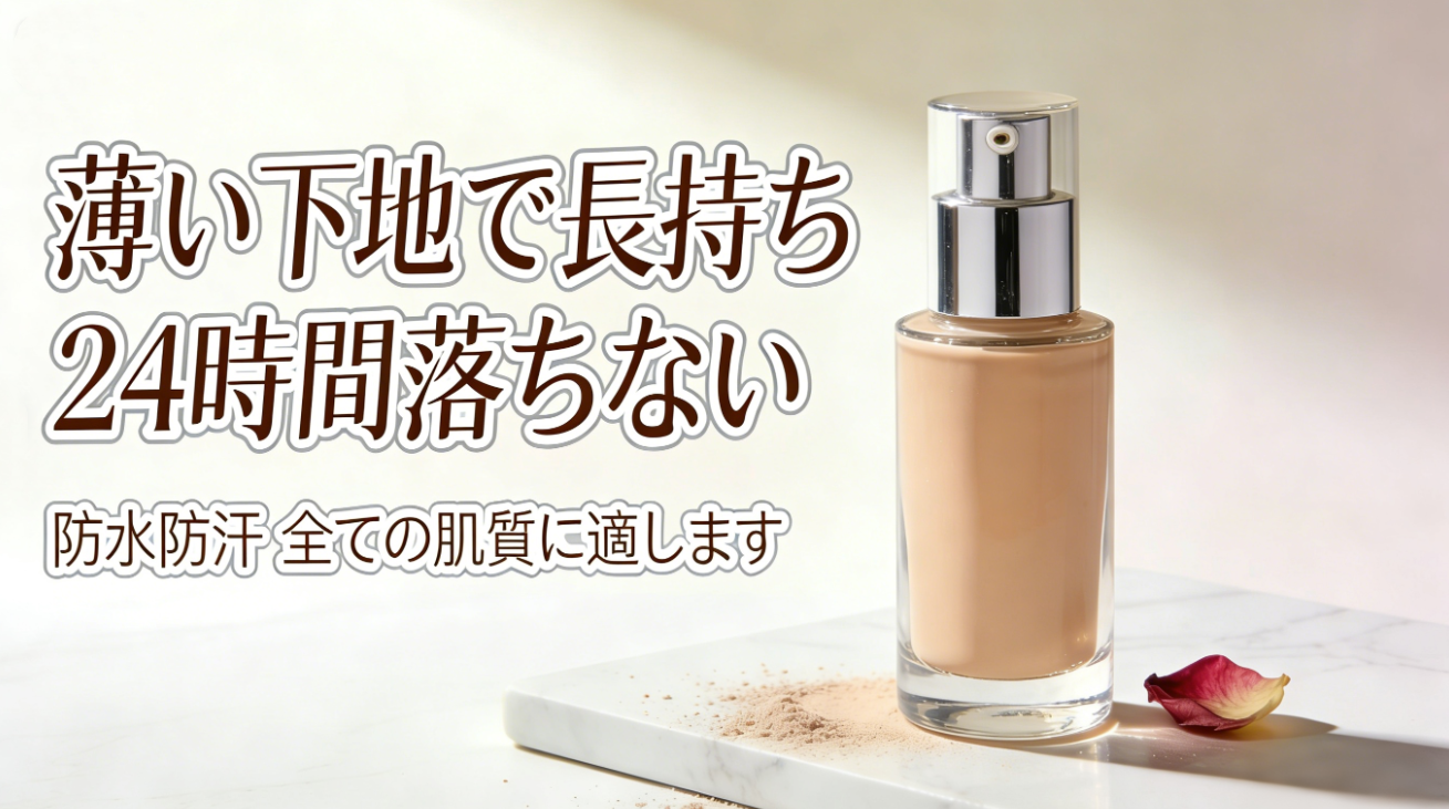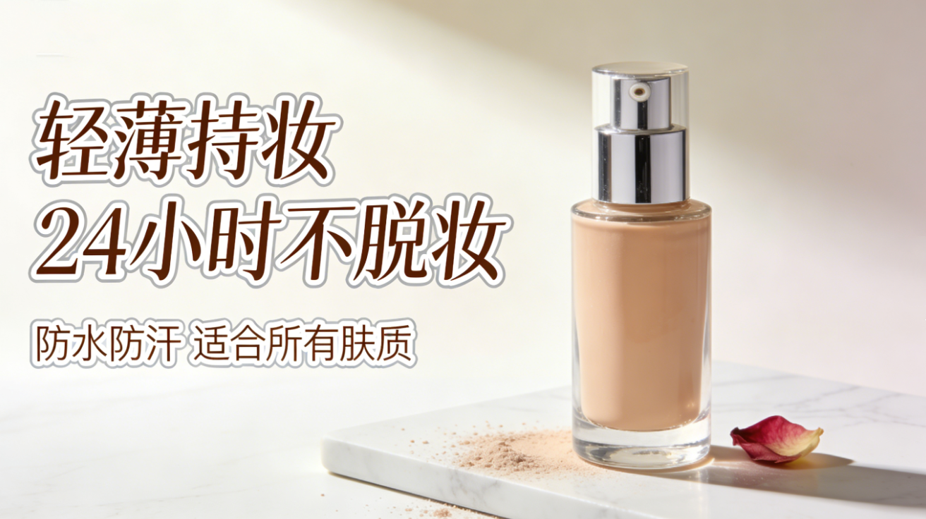 ◆原图:一张美妆粉底液详情图,包含中文文案"轻薄持妆 24小时不脱妆""防水防汗 适合所有肤质",文字采用粉色圆角艺术字,搭配浅灰色阴影边框,排版在产品左侧留白区域。