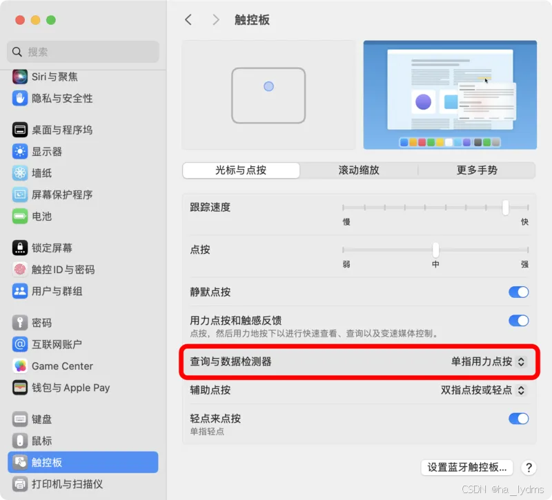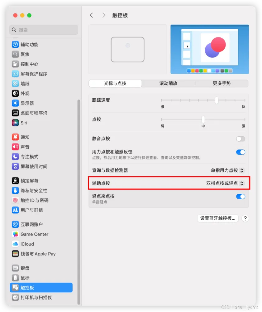 macOS 13:点击屏幕左上角苹果图标,点击【系统设置】,在左侧栏最下方找到【触控板】,点击进入,在【光标与点按】中将【辅助点按】设置为【双指轻点或点按】(或点按左下角、点按右下角)。