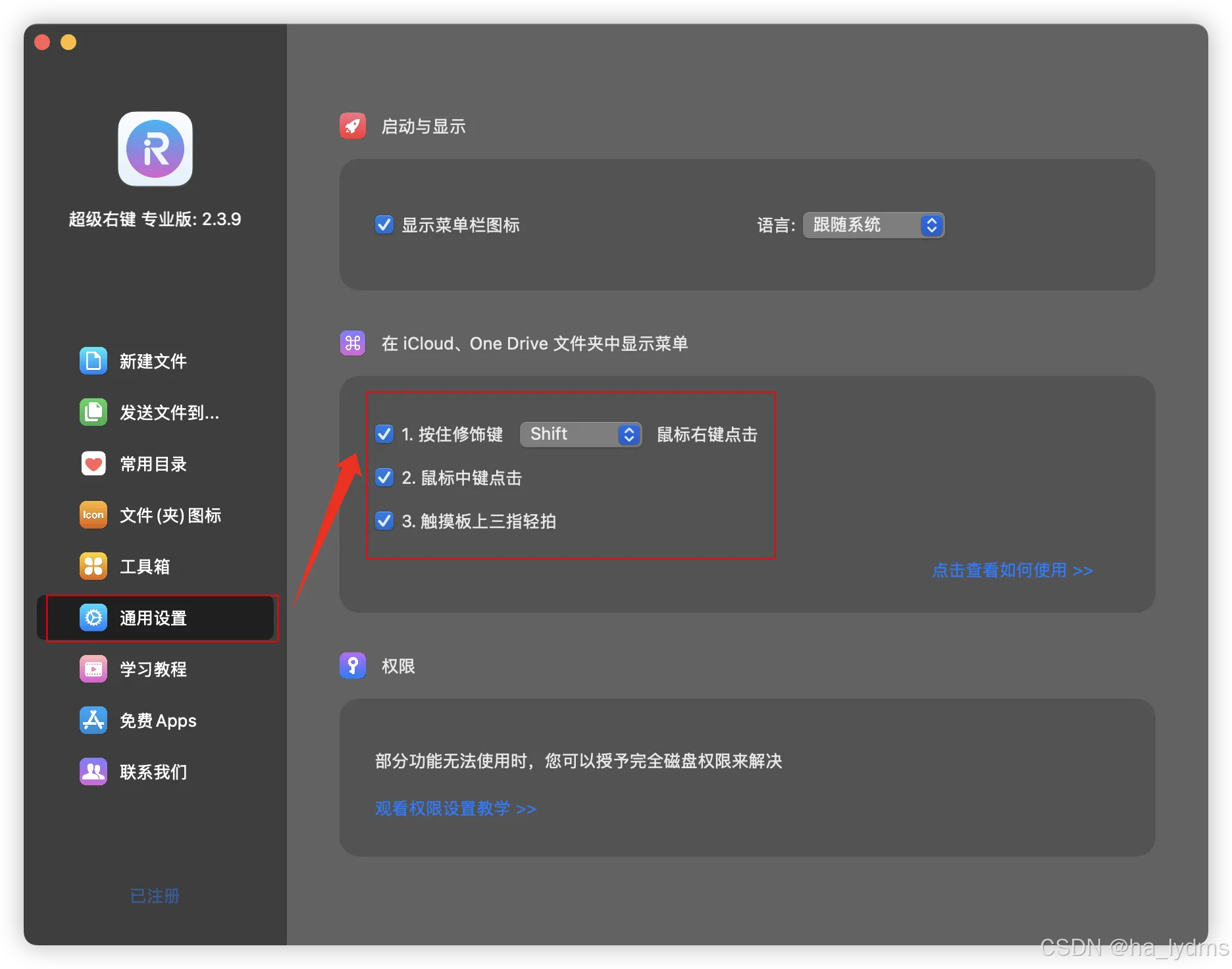 注意事项:勾选【在iCloud、One Drive 文件夹中显示菜单】后,超级右键会被设置为开机自启动。
