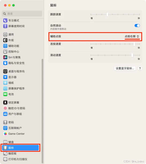 macOS 13:点击屏幕左上角苹果图标,点击【系统设置】,在左侧栏最下方找到【鼠标】,点击进入,在【光标与点按】中将【辅助点按】设置为【点按右侧】。
