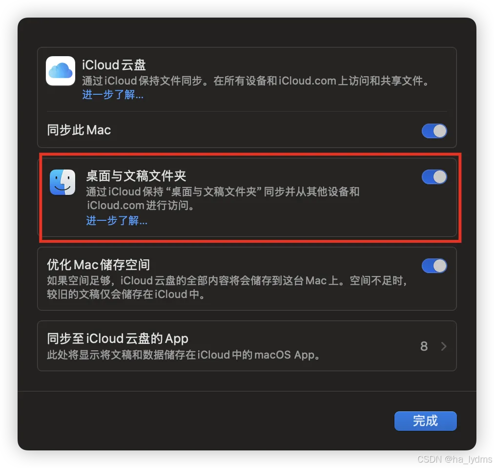 在macOS 14之后,Apple禁用了在iCloud同步文件夹中使用访达扩展类App,如果您在"桌面"和"文稿"里开启了iCloud同步(如下图所示),则无法在"桌面"、"文稿"文件夹中显示右键菜单。但您仍可以在其他文件夹中正常使用。