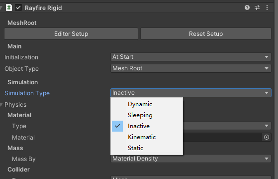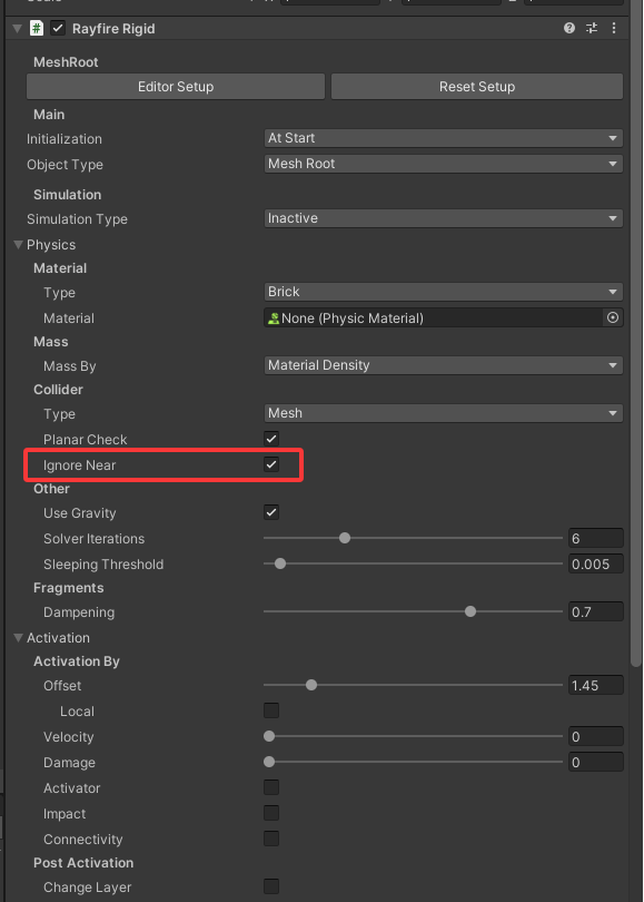这是因为模型使用的是MeshCollider,连接处可能会发生碰撞(几乎是一定的)。避免这样应该在RayfireRigid中,勾选IgnoreNear ,如图1