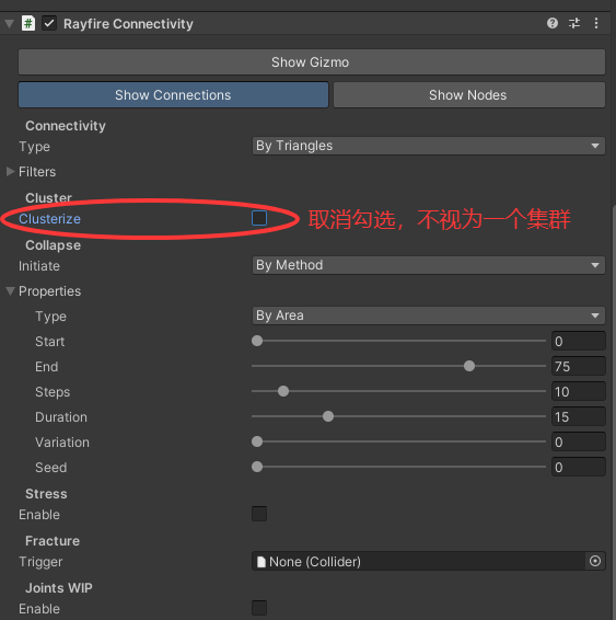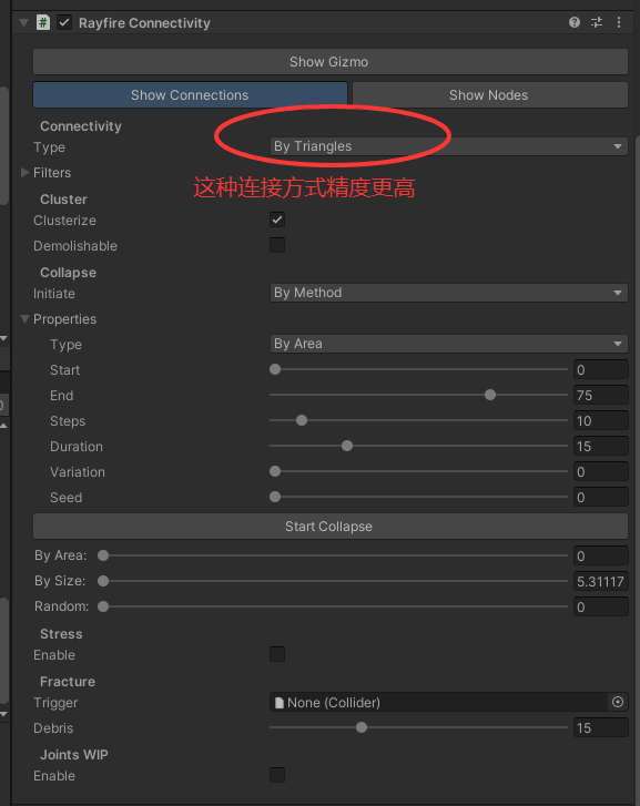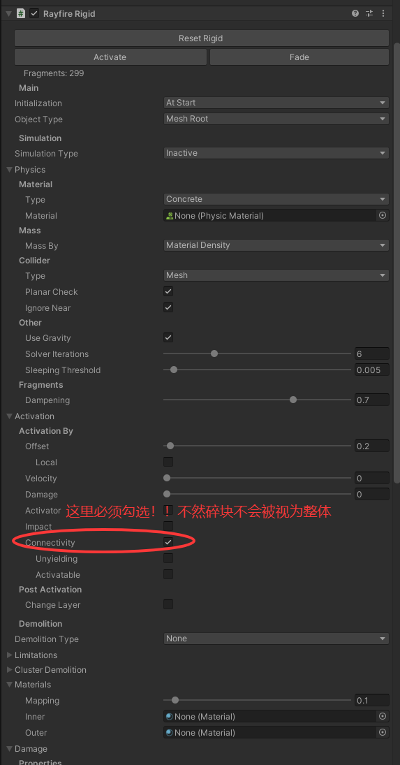 这个就需要用到Rayfire Connectivity了,把这栋建筑看成一个整体,我们先使用默认设置,把Rayfire Connectivity挂上,然后RayfireRigid勾选Connectivity ,如图4,图5