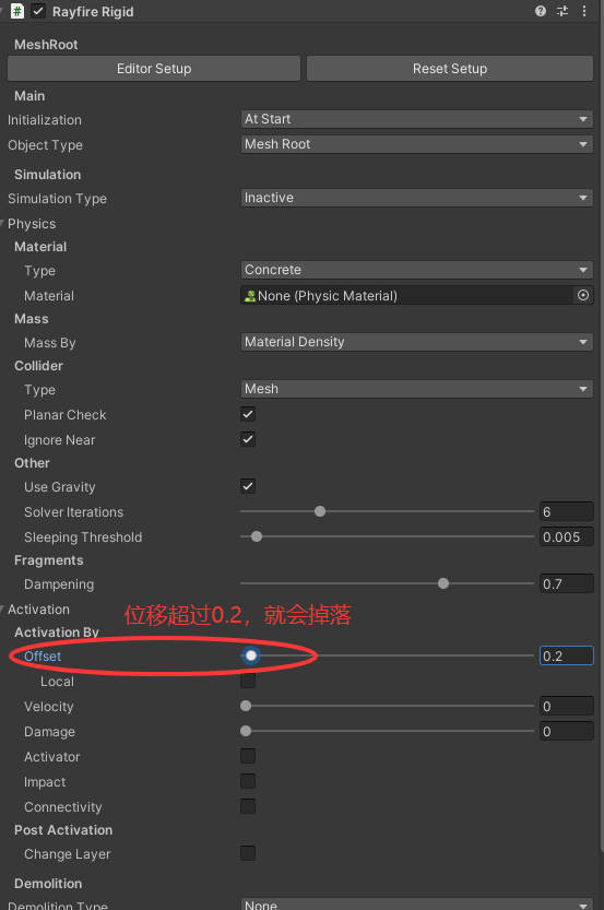 这是因为没有设置激活条件 ,激活条件一般是通过位移,比如位移超过了0.2,就激活碎块掉落,如图3: