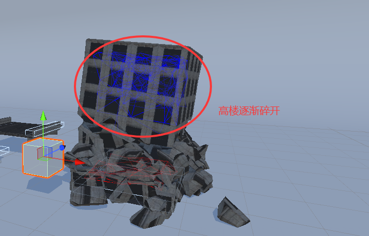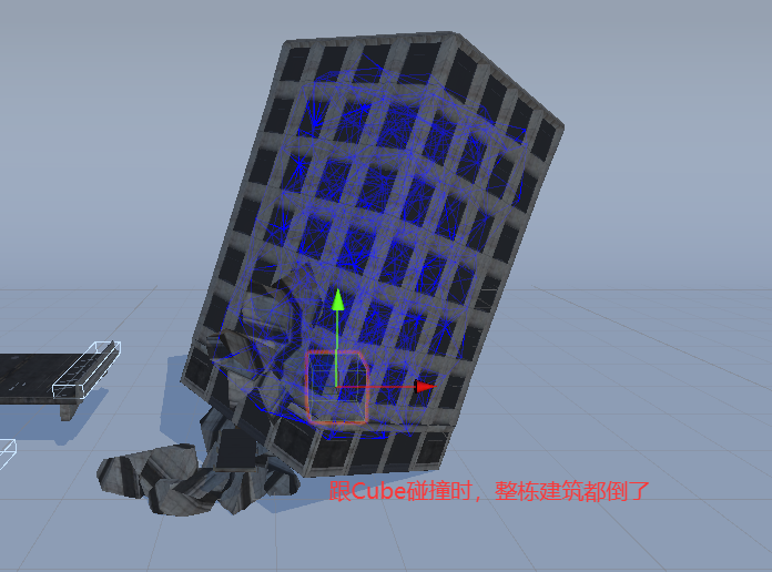 假如我既想要建筑物为一个整体,他们塌陷时,第一时间应该是一个整体,上半层碰到地面时,开始逐渐碎开,这时不应该是一个整体了