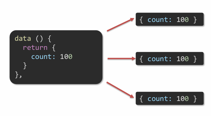 每次创建新的组件实例,都会新执行一次data 函数,得到一个新对象。