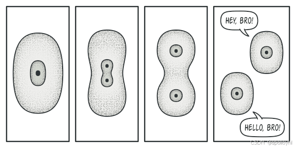 由于工业原型并不真正自我复制,更接近这种模式的类比是有丝分裂细胞分裂过程(还记得吗?)。有丝分裂后,形成一对相同的细胞。原始细胞作为原型,积极参与复制的创建。