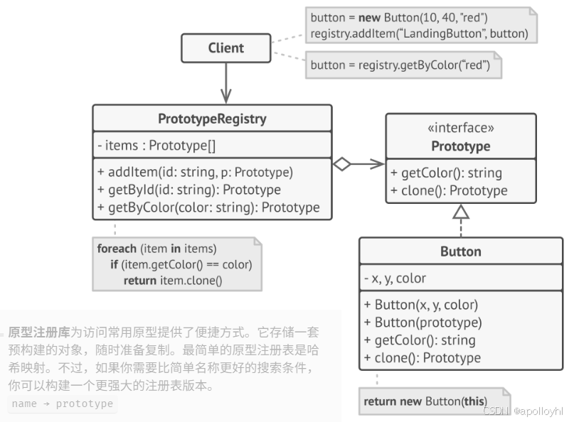 原型模式将克隆过程委托给被克隆的实际对象。该模式为所有支持克隆的对象声明了一个通用接口。这个界面允许你克隆一个对象,而不必将代码与该对象的类耦合。通常,这样的接口只包含一个方法。clone