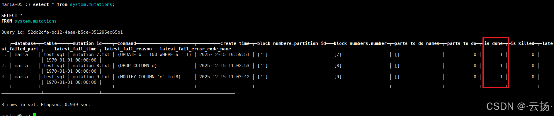 ClickHouse中没有传统的update和delete,这类数据变更操作被称为mutation(属于DDL操作)。通过该语句可查看mutation队列状态,判断数据变更是否完成。