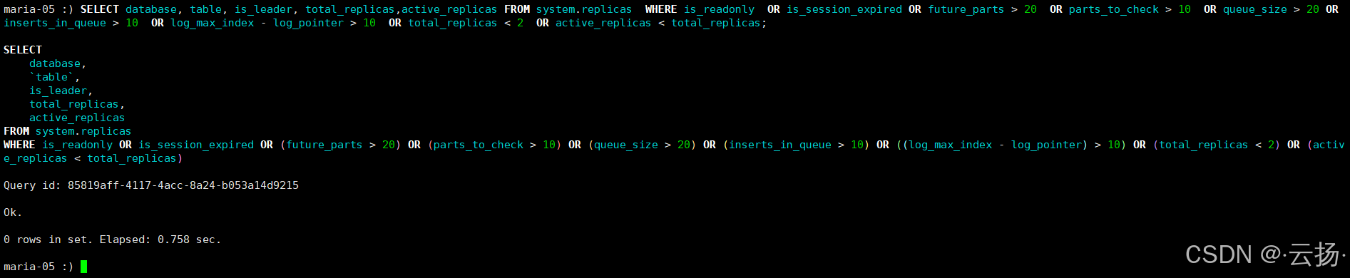 针对ClickHouse副本集群,该语句可筛选出存在复制异常的表,如只读副本、队列任务过多、副本数量不足等情况。