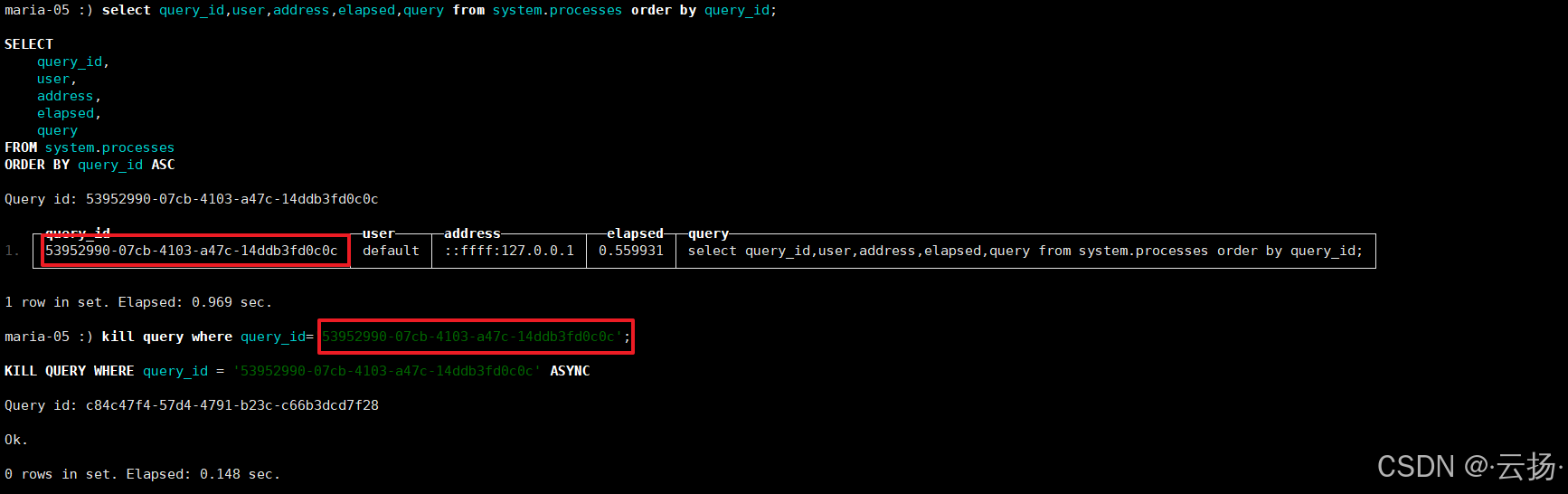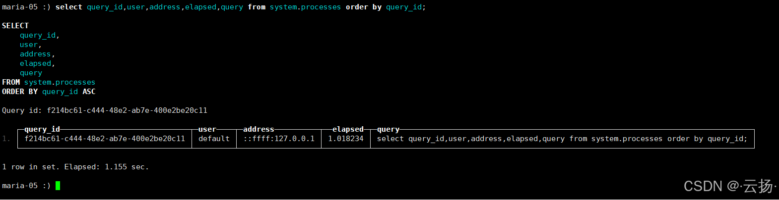 select query_id, user, address, elapsed, query from system.processes order by query_id;