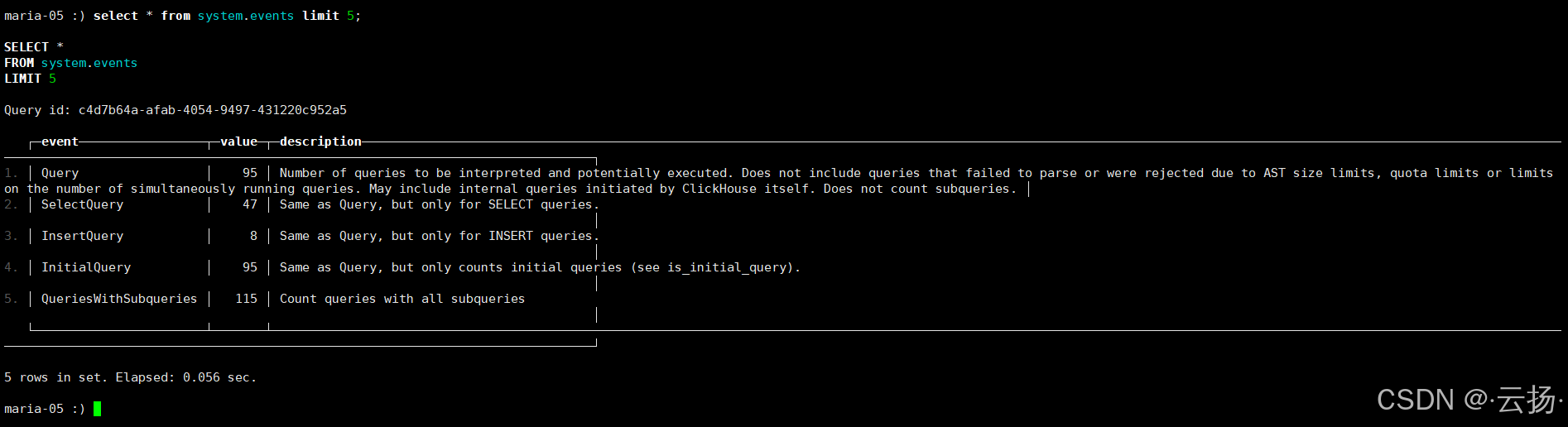 select语句执行次数等。plsqlselect * from system.events limit 5;