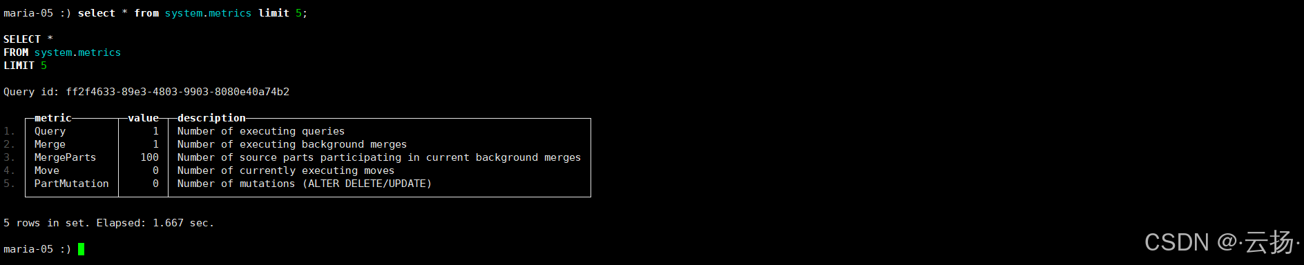 实时执行统计(system.metrics):查看当前实例的实时状态,如正在执行的查询次数、合并操作次数等。