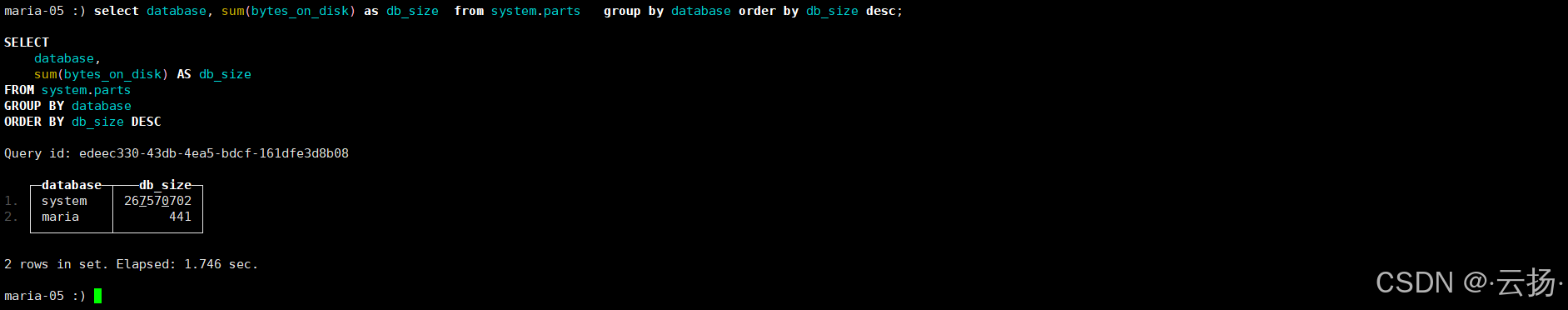 该语句可按数据库、表、分区维度,查看每个数据分片的磁盘占用情况,便于定位大表或大分区。