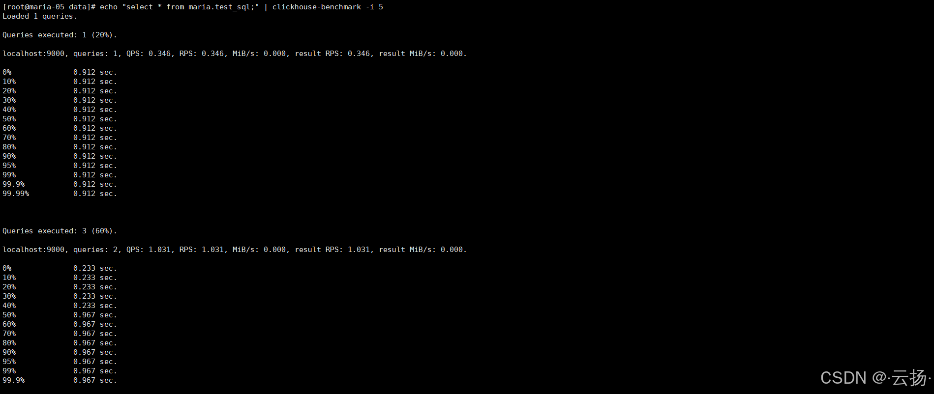 ClickHouse自带clickhouse-benchmark工具,可对SQL语句进行性能测试,输出QPS、RPS及各百分位执行时间。
