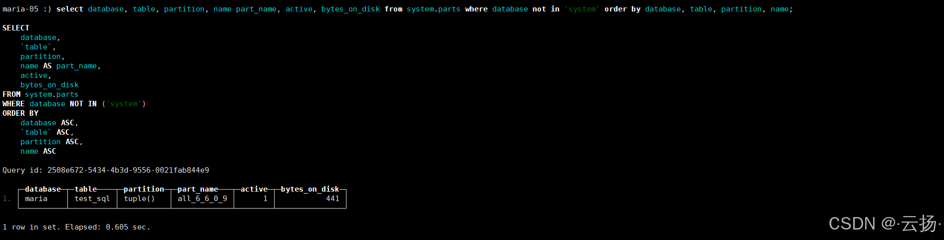 select database, table, partition, name part_name, active, bytes_on_disk