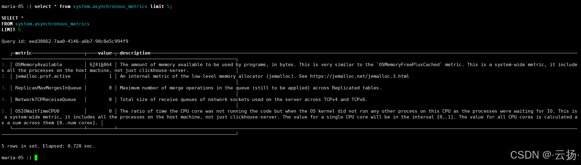 select * from system.asynchronous_metrics limit 5;