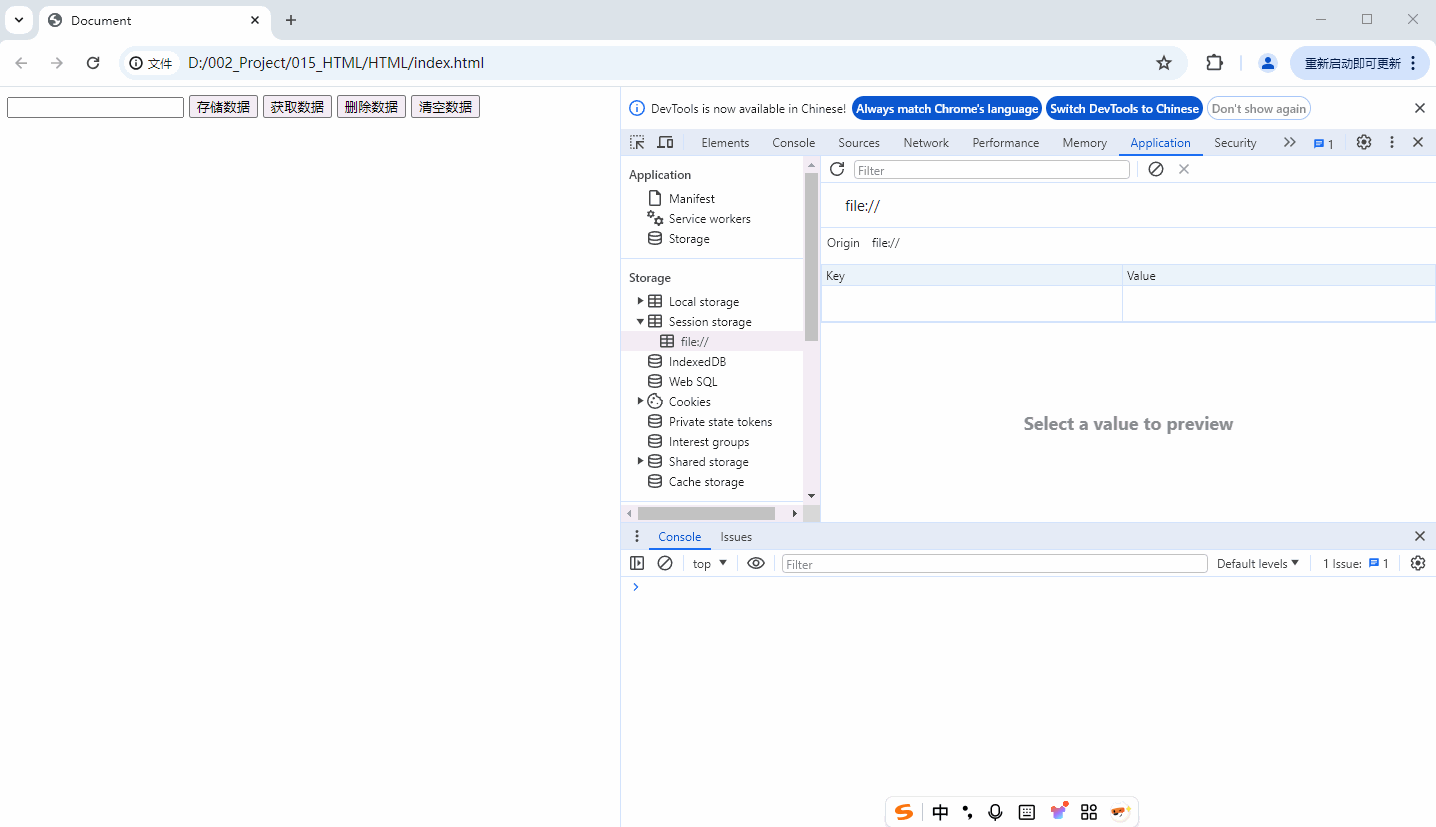 点击 清空数据 按钮 , 可以清空 session storage 的所有 键值对数据 ;