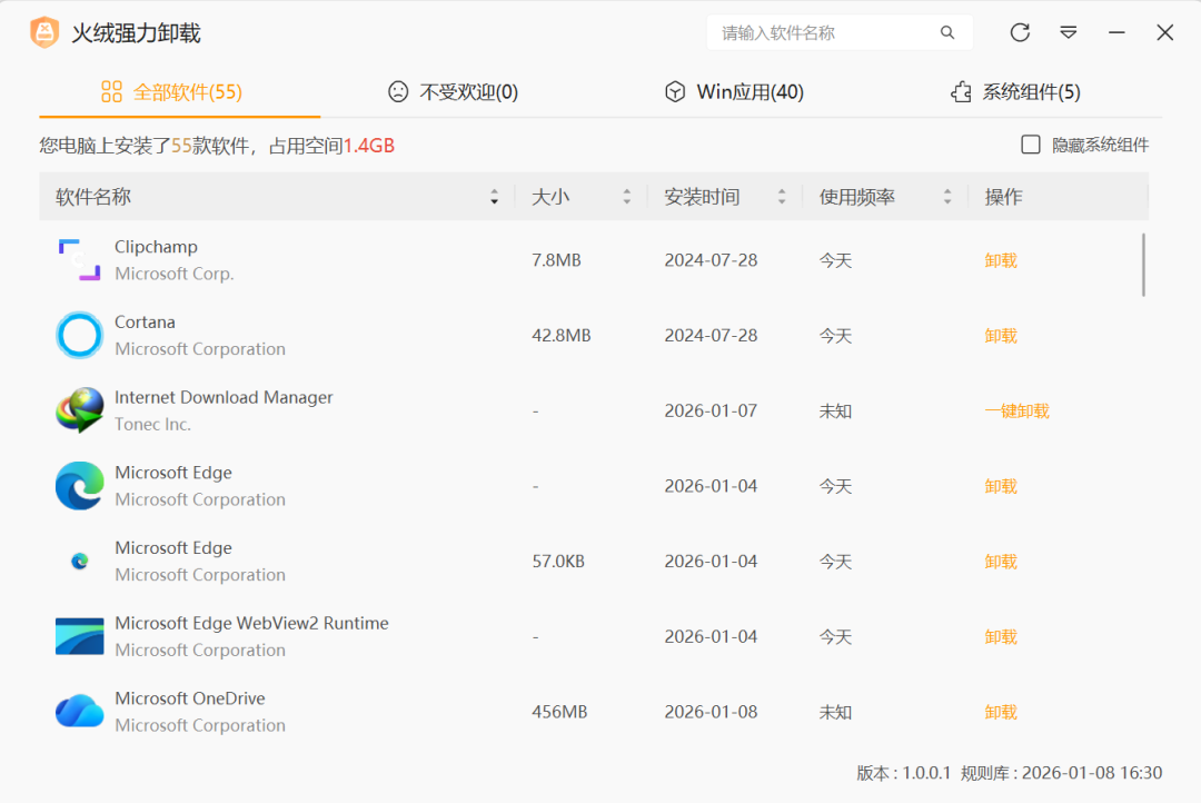 它不光能卸普通软件,连系统组件都能卸,还会列出【不受欢迎】的软件(比如流氓预装),对小白来说太友好了,一眼就知道该卸啥。