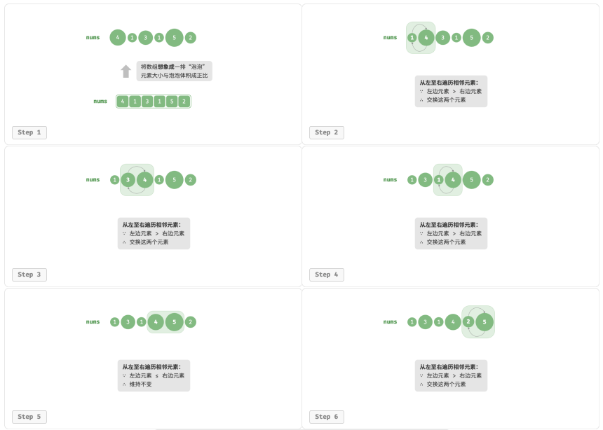 - 以此类推,经过 n-1 轮"冒泡"后,前 n-1 大的元素都被交换至正确位置。