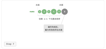 - 首先,对 n 个元素执行"冒泡",将数组的最大元素交换至正确位置。