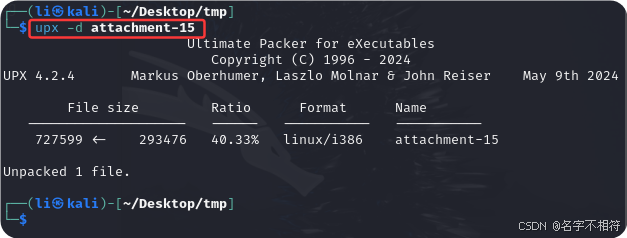 由检测结果可知,该文件被UPX加壳,尝试脱壳,将文件放入kali虚拟机中,输入命令