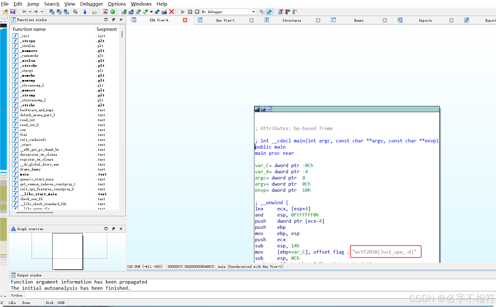 脱壳完成,再将其放入有ida的环境中,我这里是放到了主机上面,用ida64打开,出现结果