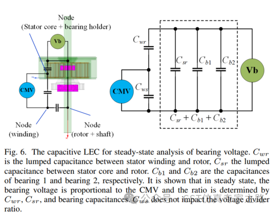 轴电压仿真外围电路与电驱系统EMC仿真的电路非常近似,区别之处在于几个关键的分布电容的设置。参考论文中Fig6给出了轴电压的等效电路图,Cws 是绕组对定子,Cwr 是绕组对转子,Csr 是定子对转子,Cb 是轴承内外圈的等效电容。在仿真建模初期,需要借助测量手段得到准确的电容值,这是精确仿真轴电压的前提条件。在设置Cb的容值时,我们也参考了论文中的测量结果。