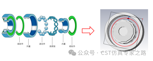 轴承的主要3D结构主要由内圈、外圈、保持架及钢球组成。轴承在转动过程中,钢球和内外圈之间会有一层油膜,可以起到绝缘的作用。在CST的建模过程中,我们只需要保留内圈、外圈的结构,在内外圈之间添加 port,来模拟内、外圈的分布电容大小。
