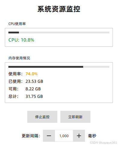 - 实时数据采集:定时获取系统 CPU 和内存使用率