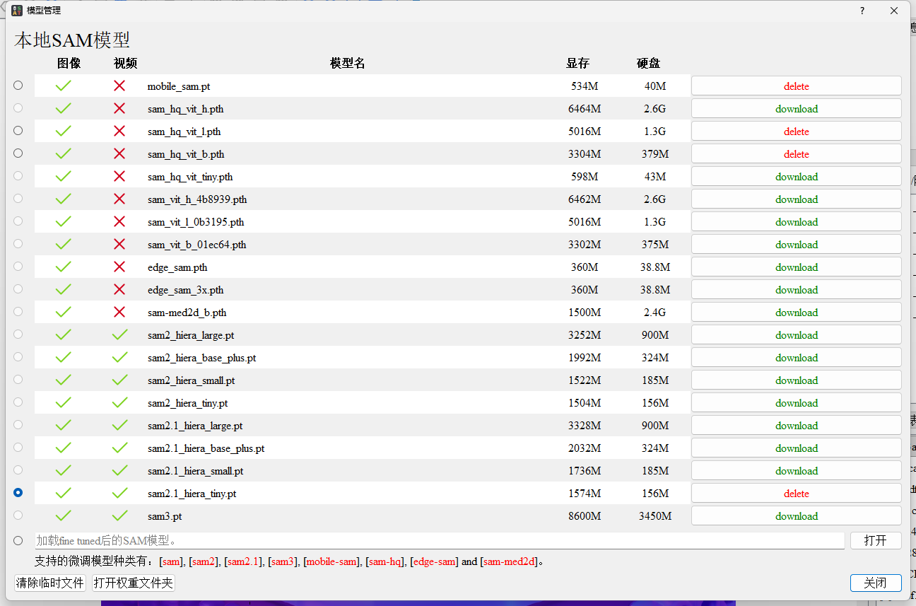 | SAM | sam_vit_h_4b8939.pth | 6462M | 2.6G | 全能型(高精度): 最原始的 SAM 模型,精度极高,适合对边缘要求极高的科研场景。 | 官方原链 |