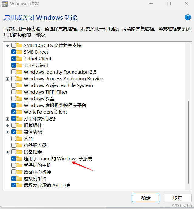 打开 "Windows 功能", 勾选上 Virtual Machine Paftform(虚拟机平台)、适用于 Linux 的 Windows 子系统,并重启电脑。
