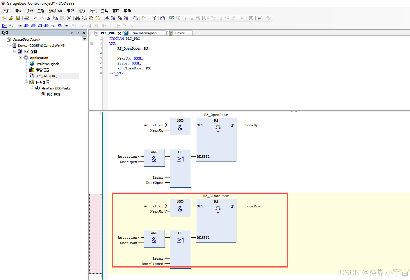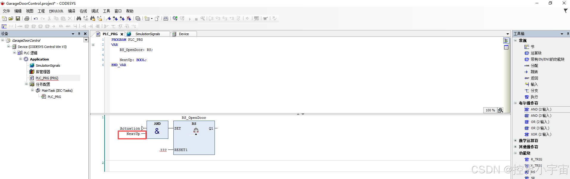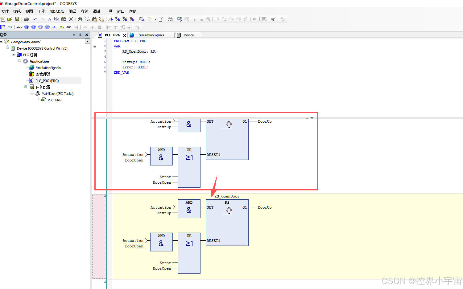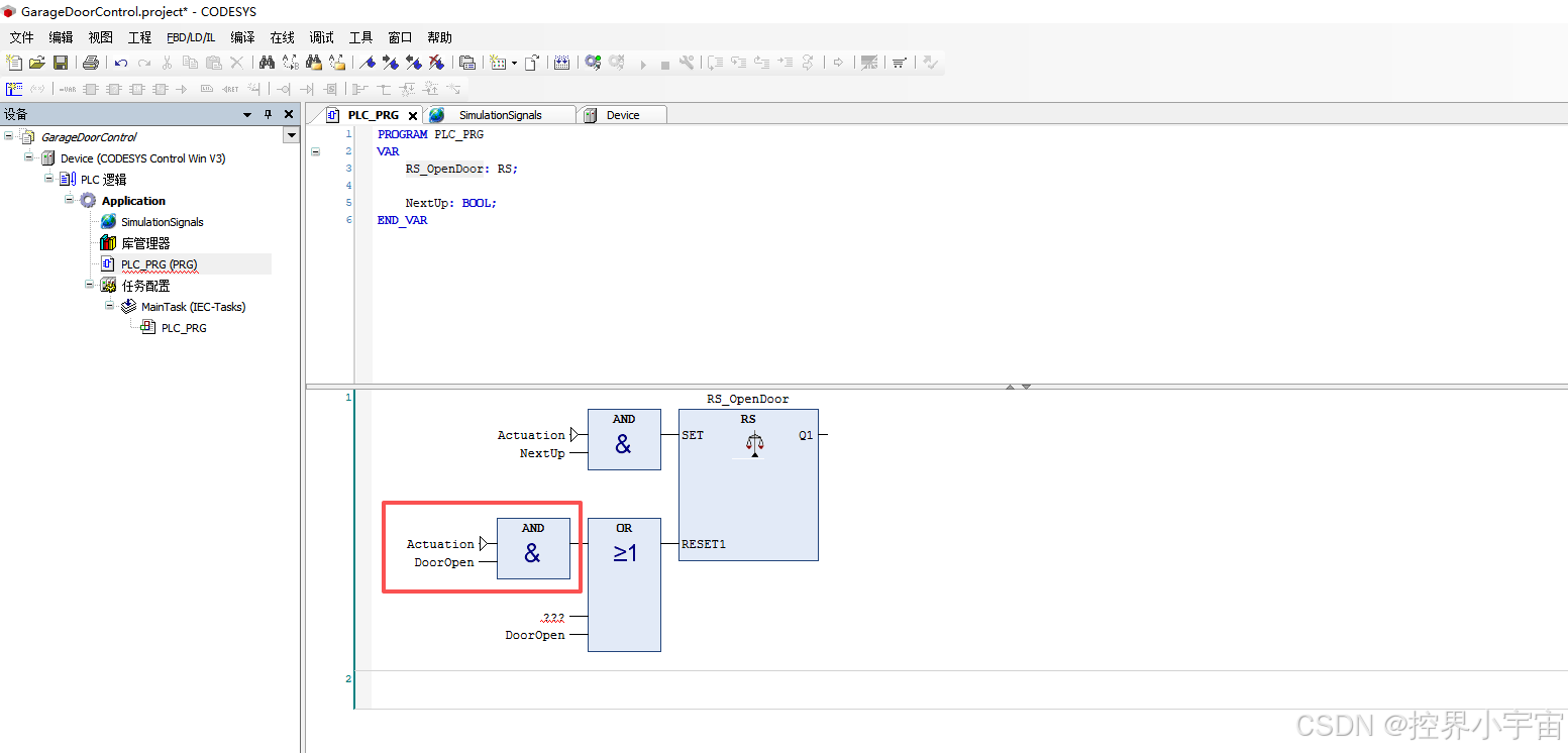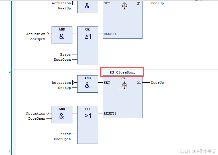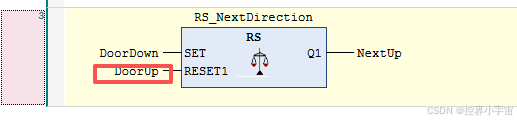 - 输出端(Q)连接:RS 功能块的 Q 端连接升门驱动"DoorUp"------置位时 DoorUp 为真,门开始打开;复位时 DoorUp 为假,门停止。