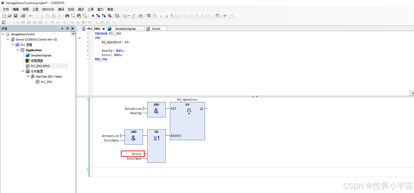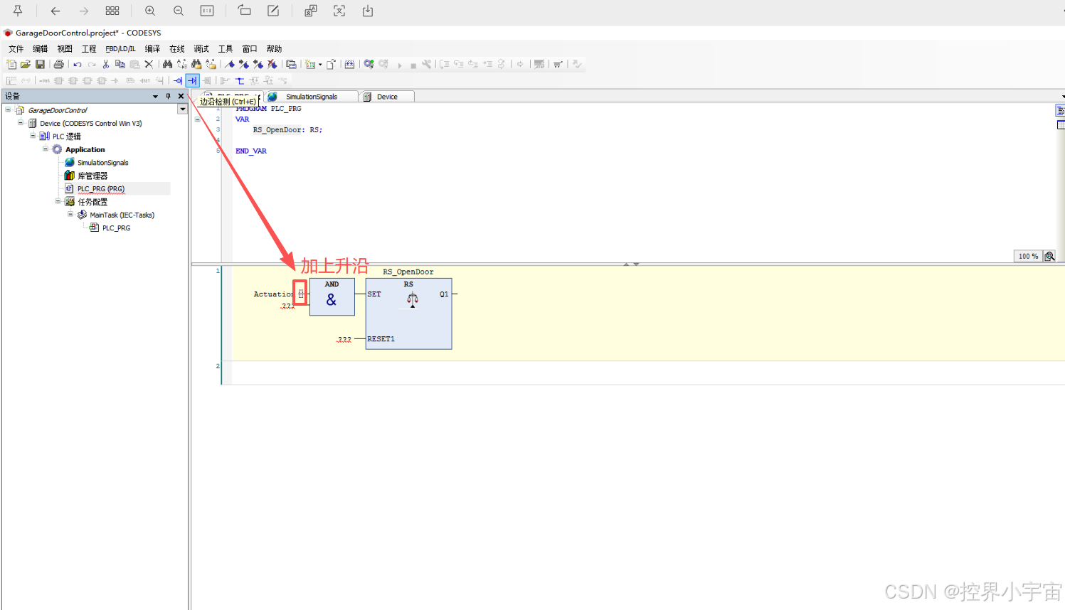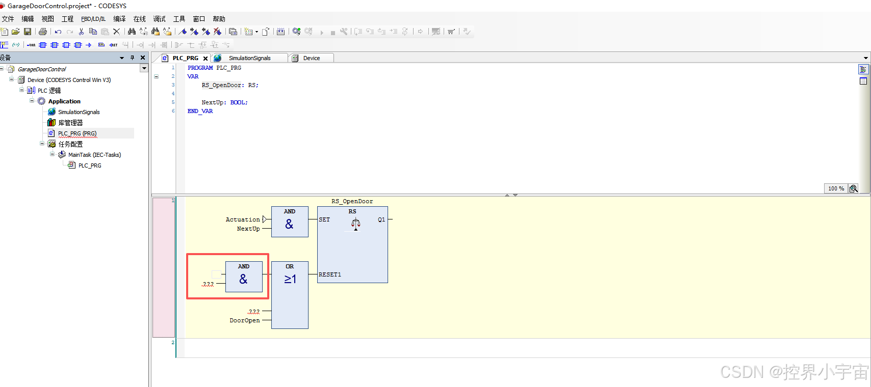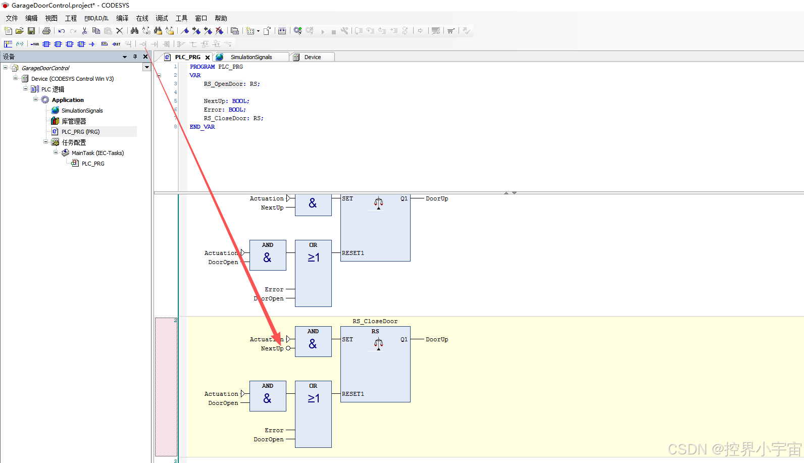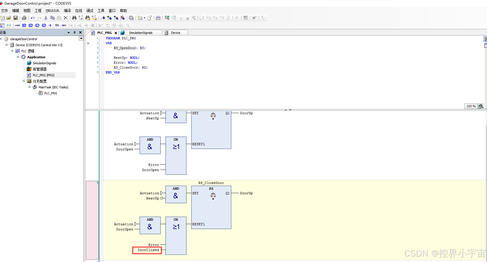 - 输出端(Q)连接:RS 功能块的 Q 端连接升门驱动"DoorUp"------置位时 DoorUp 为真,门开始打开;复位时 DoorUp 为假,门停止。
