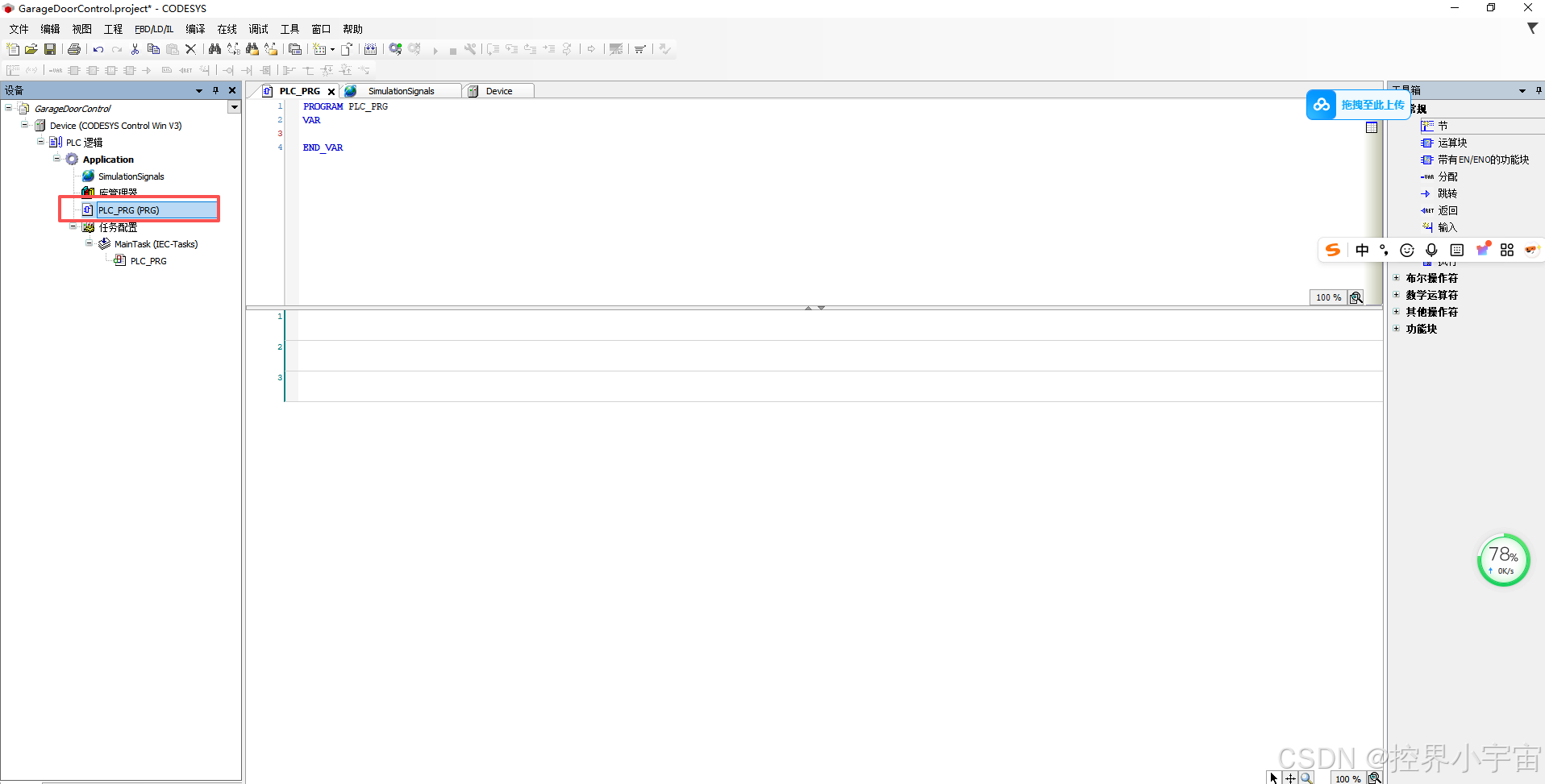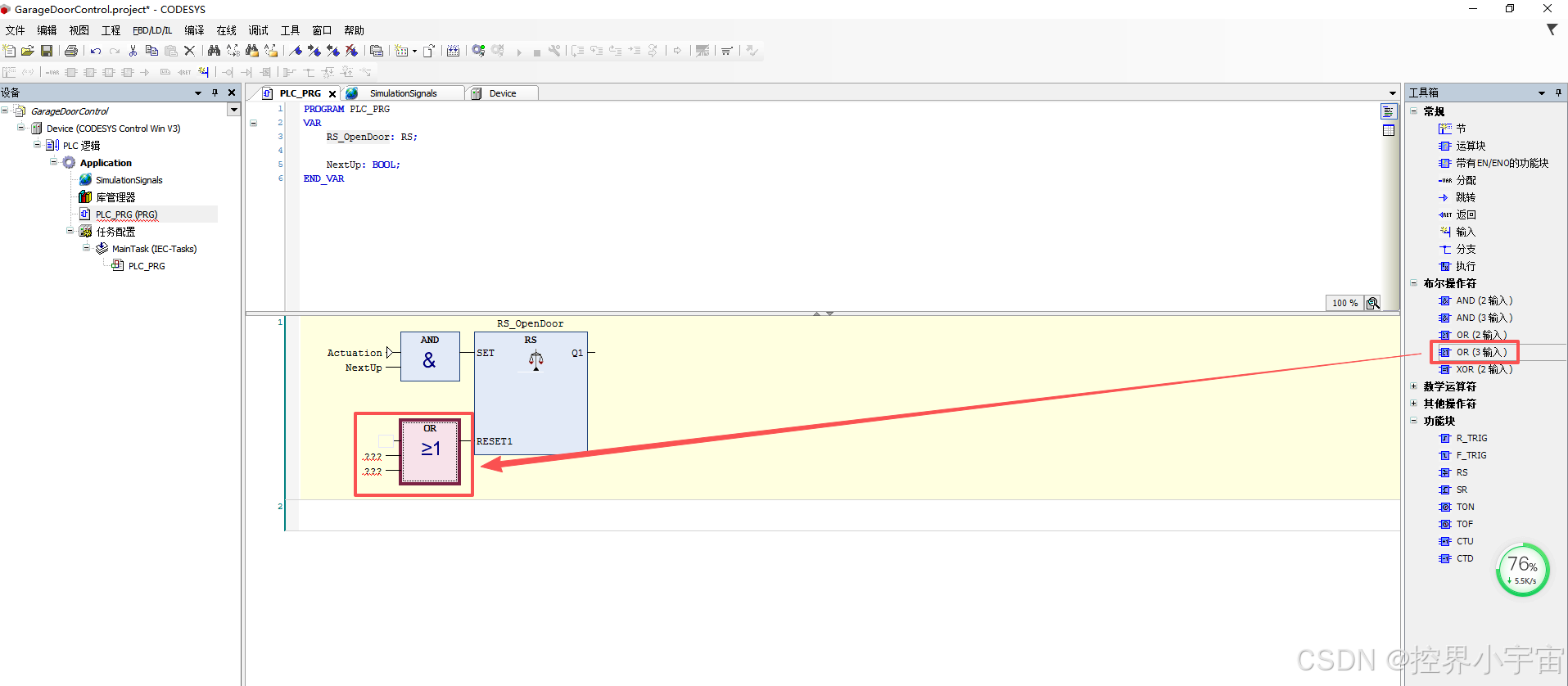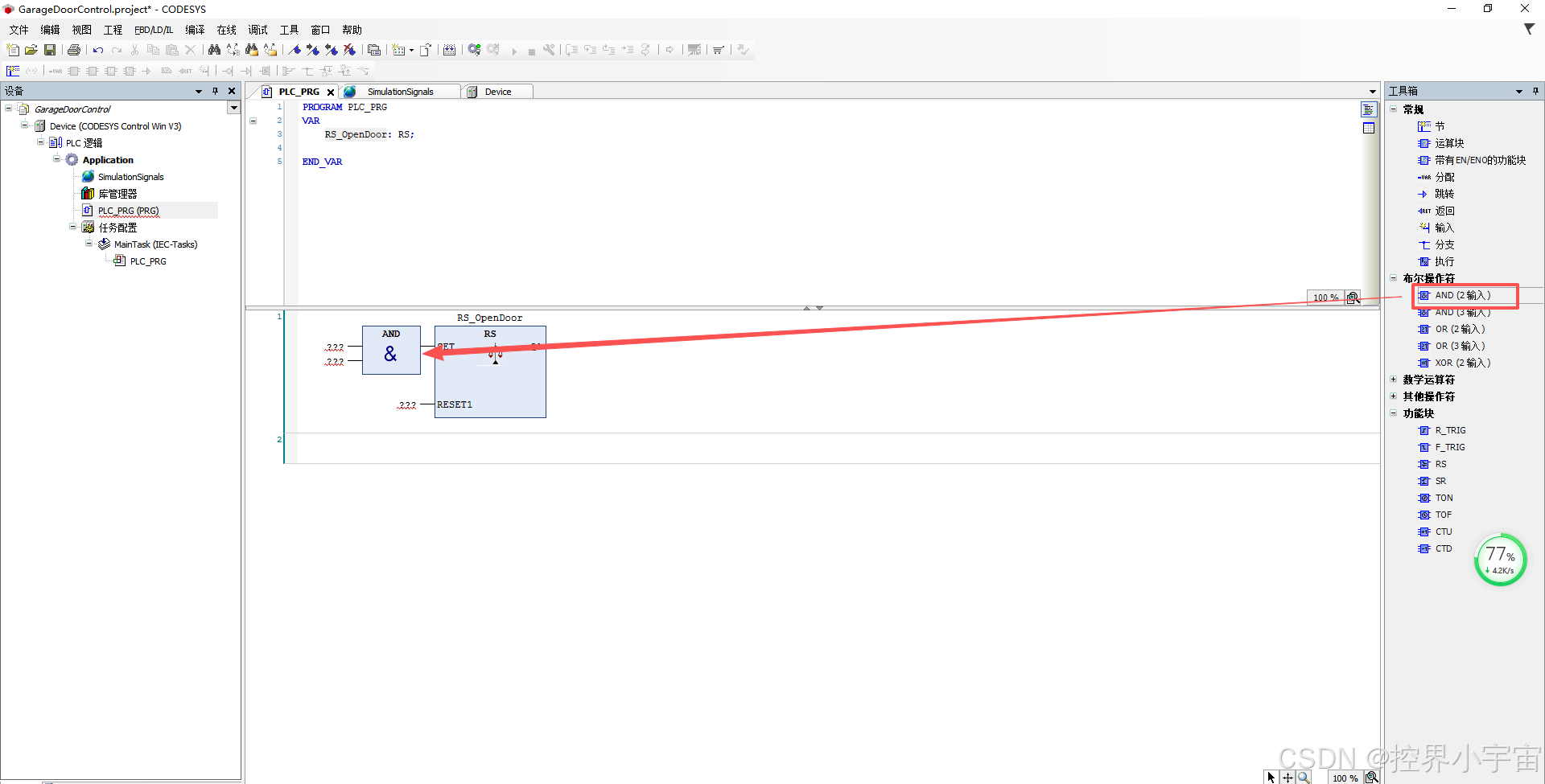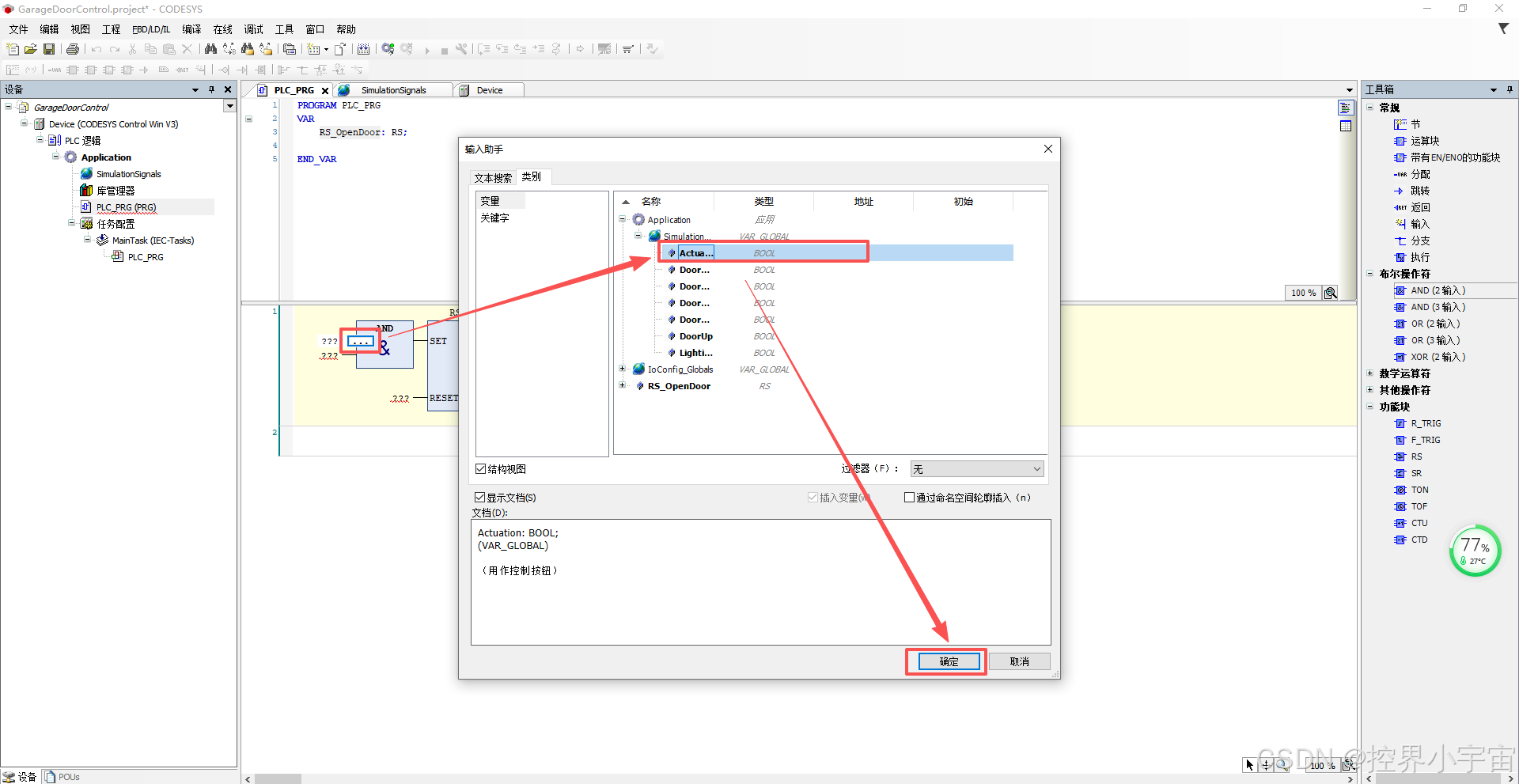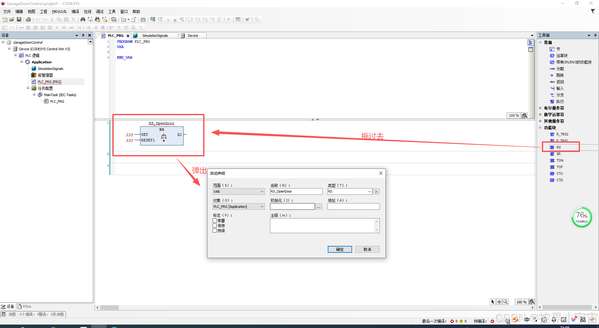 - 添加 RS 功能块:从工具箱拖拽 RS 功能块到编辑器,实例名设为"RS_OpenDoor",完成自动声明。